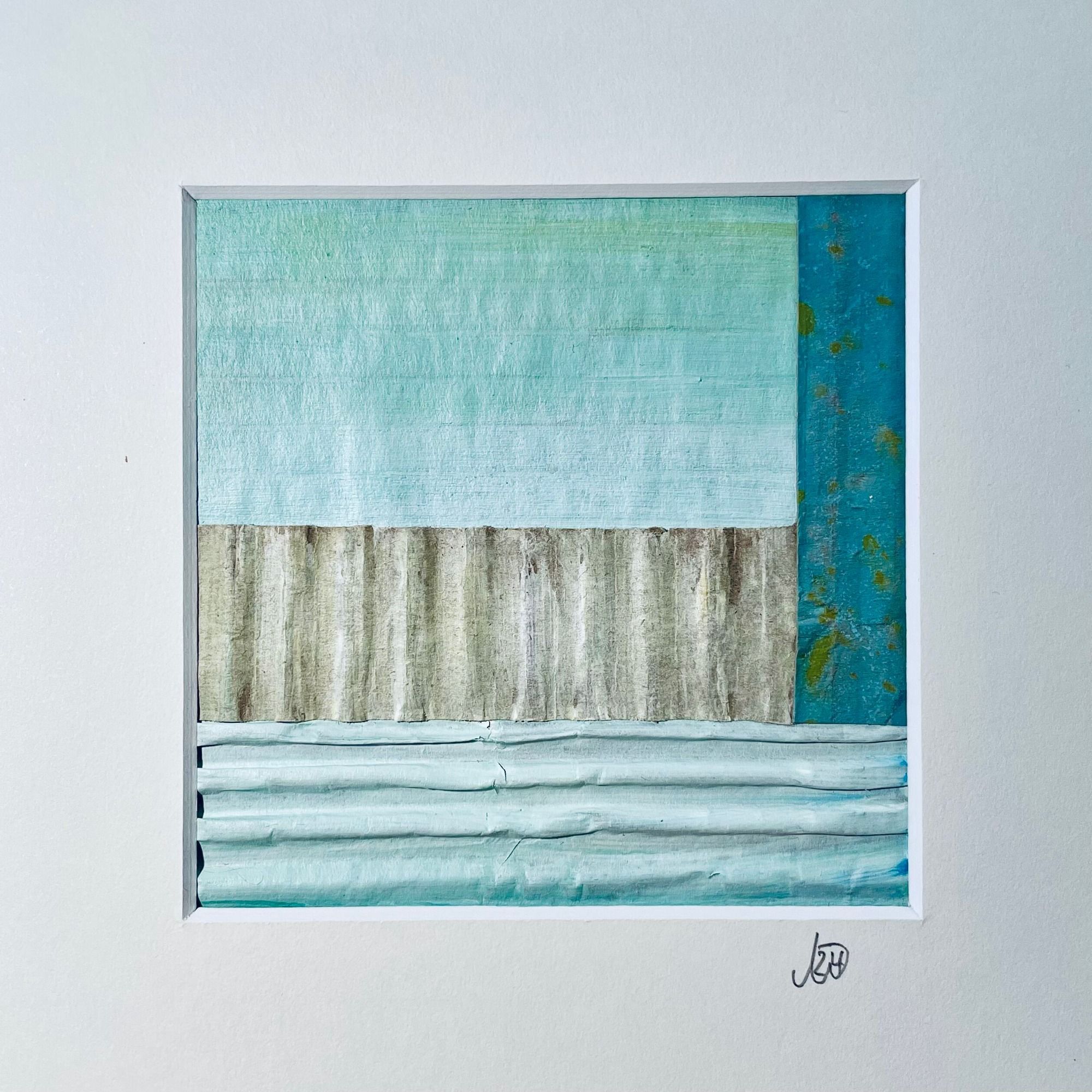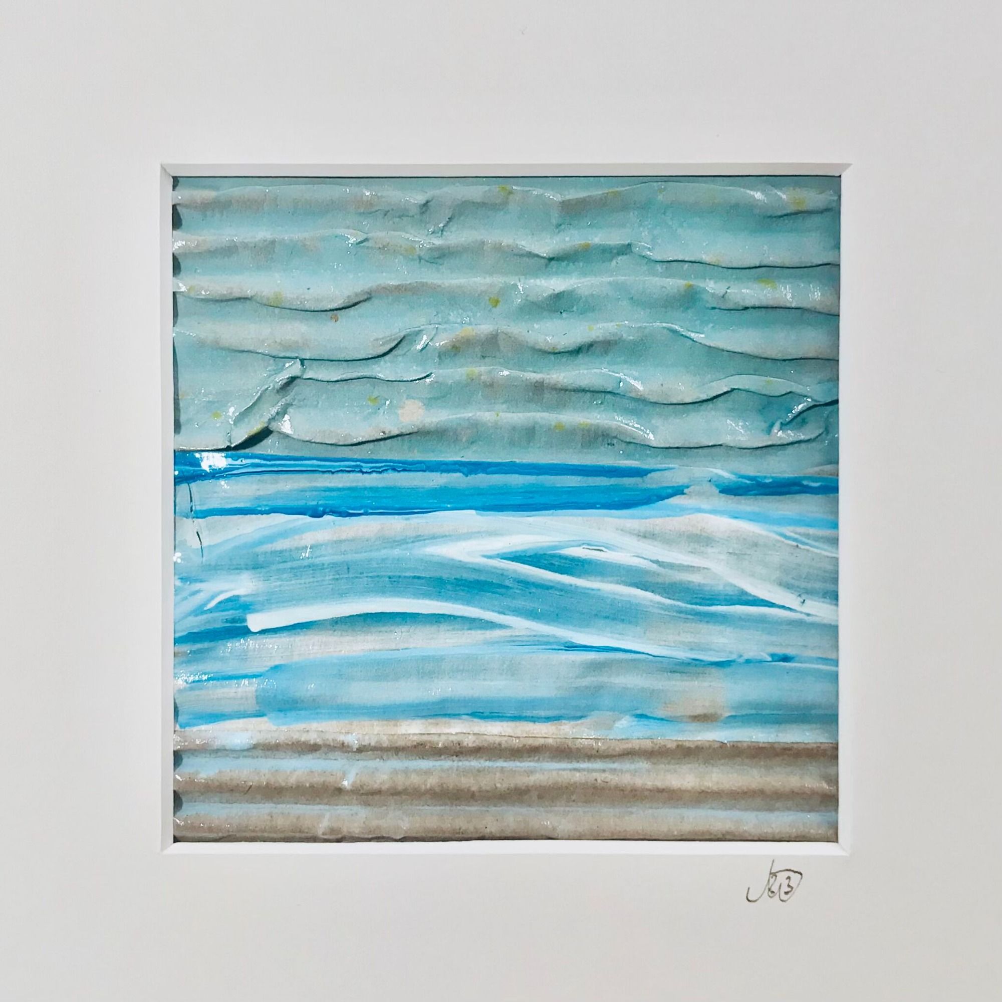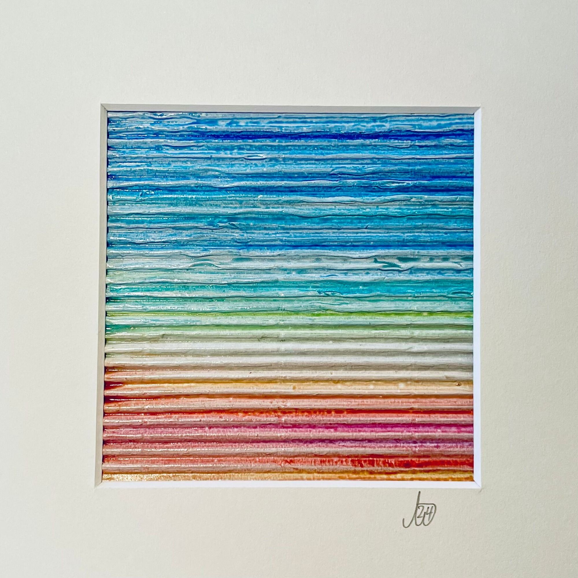 Als Medium diente dieses Mal Wellpappenkarton der, teilweise in die Einzelteile zerlegt, mit Acrylfarben bemalt und zu einem Bild gestaltet wurde. Die Bilder sind 10cm x 10cm groß und in einen 20cm x 20cm großen dorée Profi-Passepartout eingepasst.