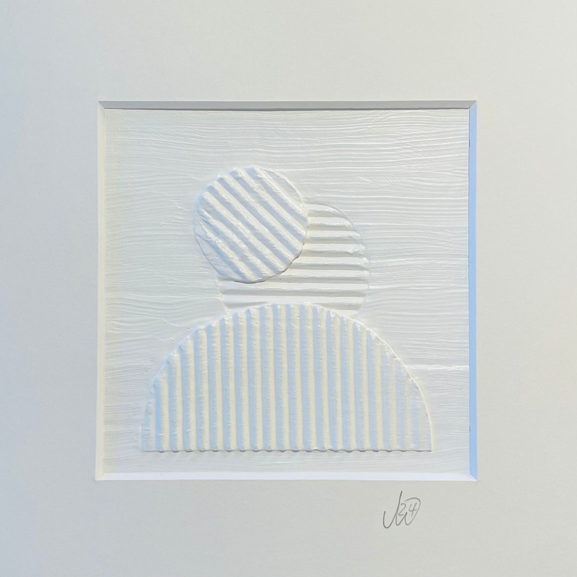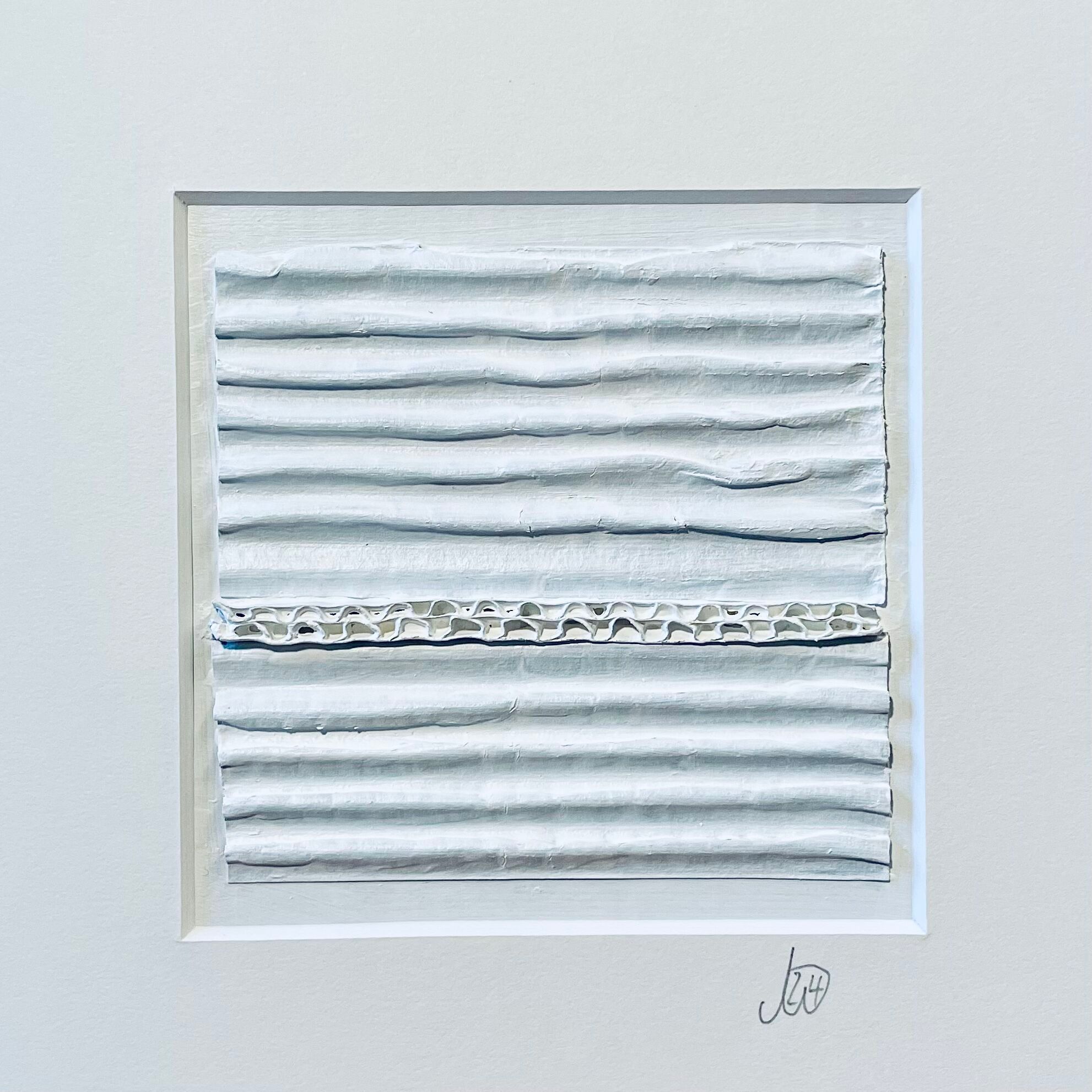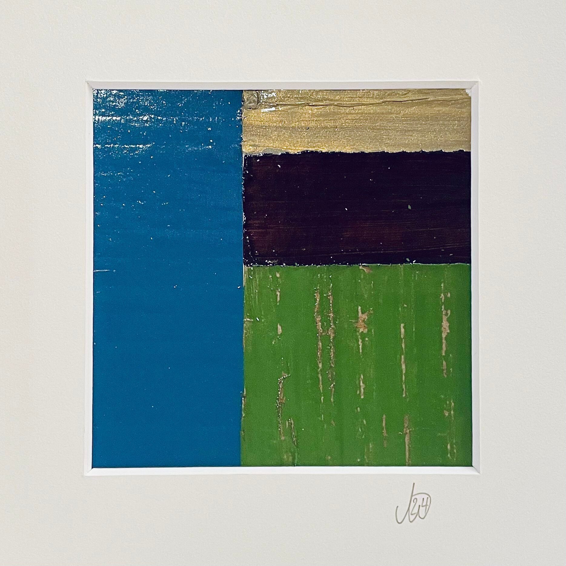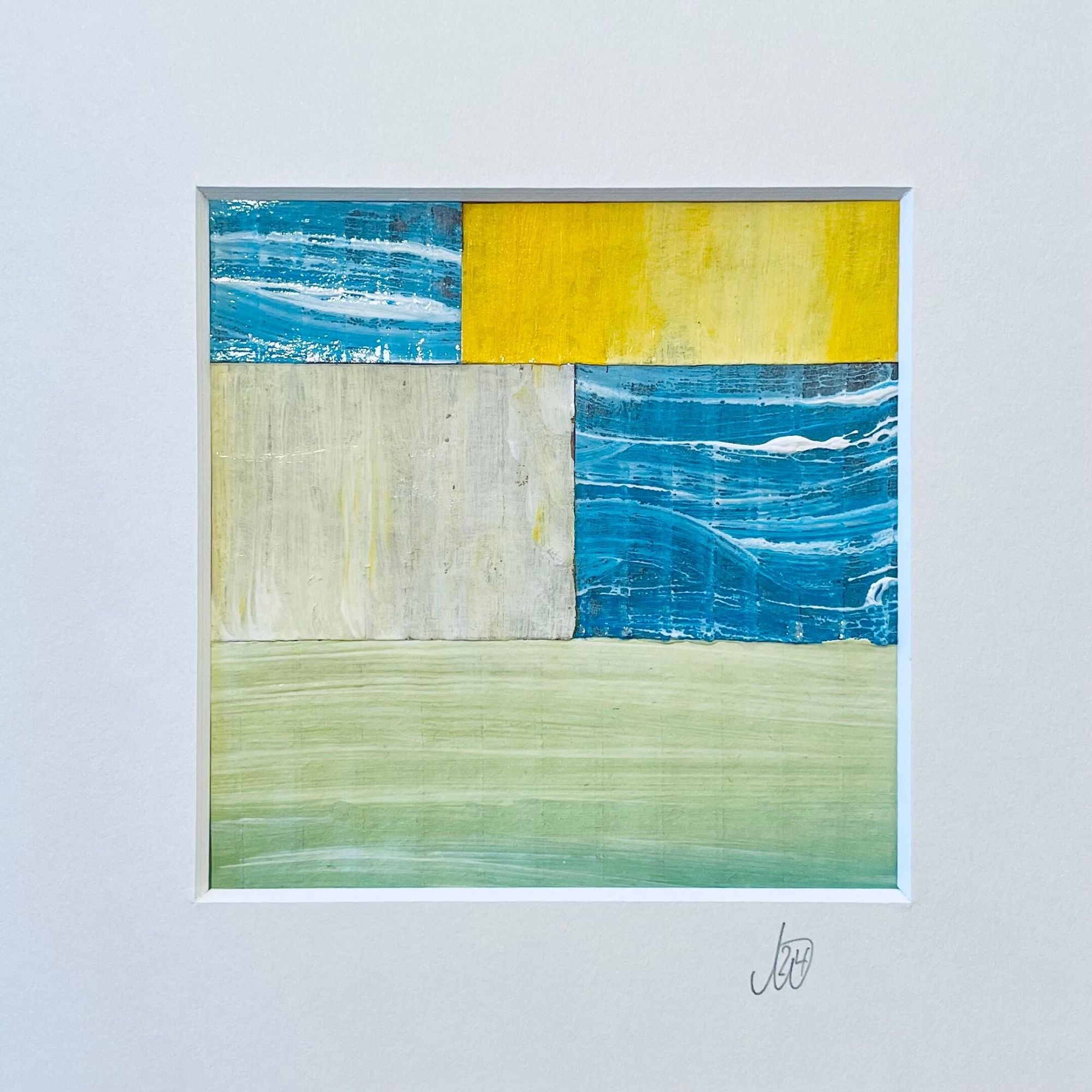 Als Medium diente dieses Mal Wellpappenkarton der, teilweise in die Einzelteile zerlegt, mit Acrylfarben bemalt und zu einem Bild gestaltet wurde. Die Bilder sind 10cm x 10cm groß und in einen 20cm x 20cm großen dorée Profi-Passepartout eingepasst.